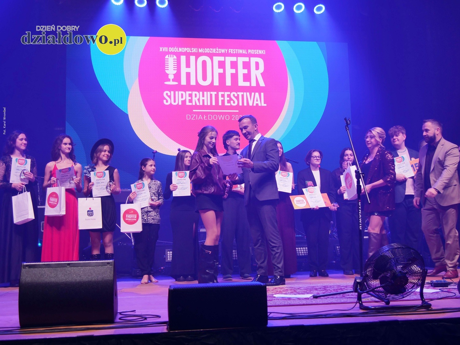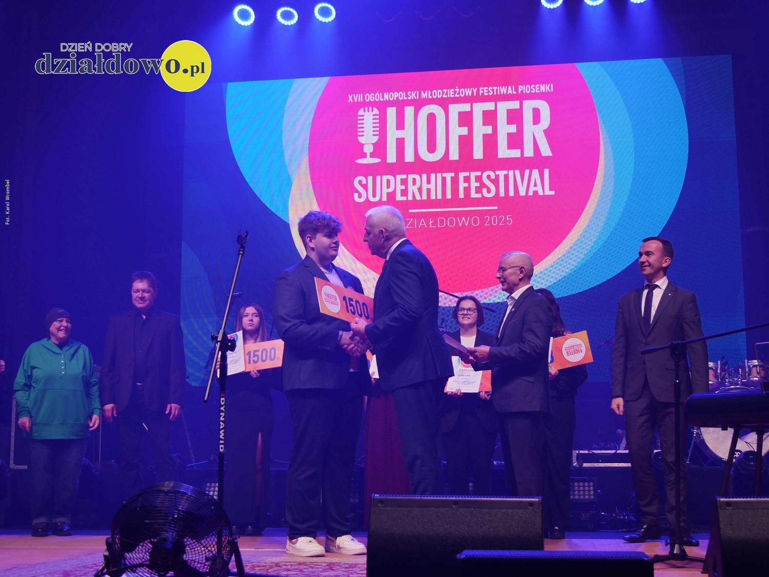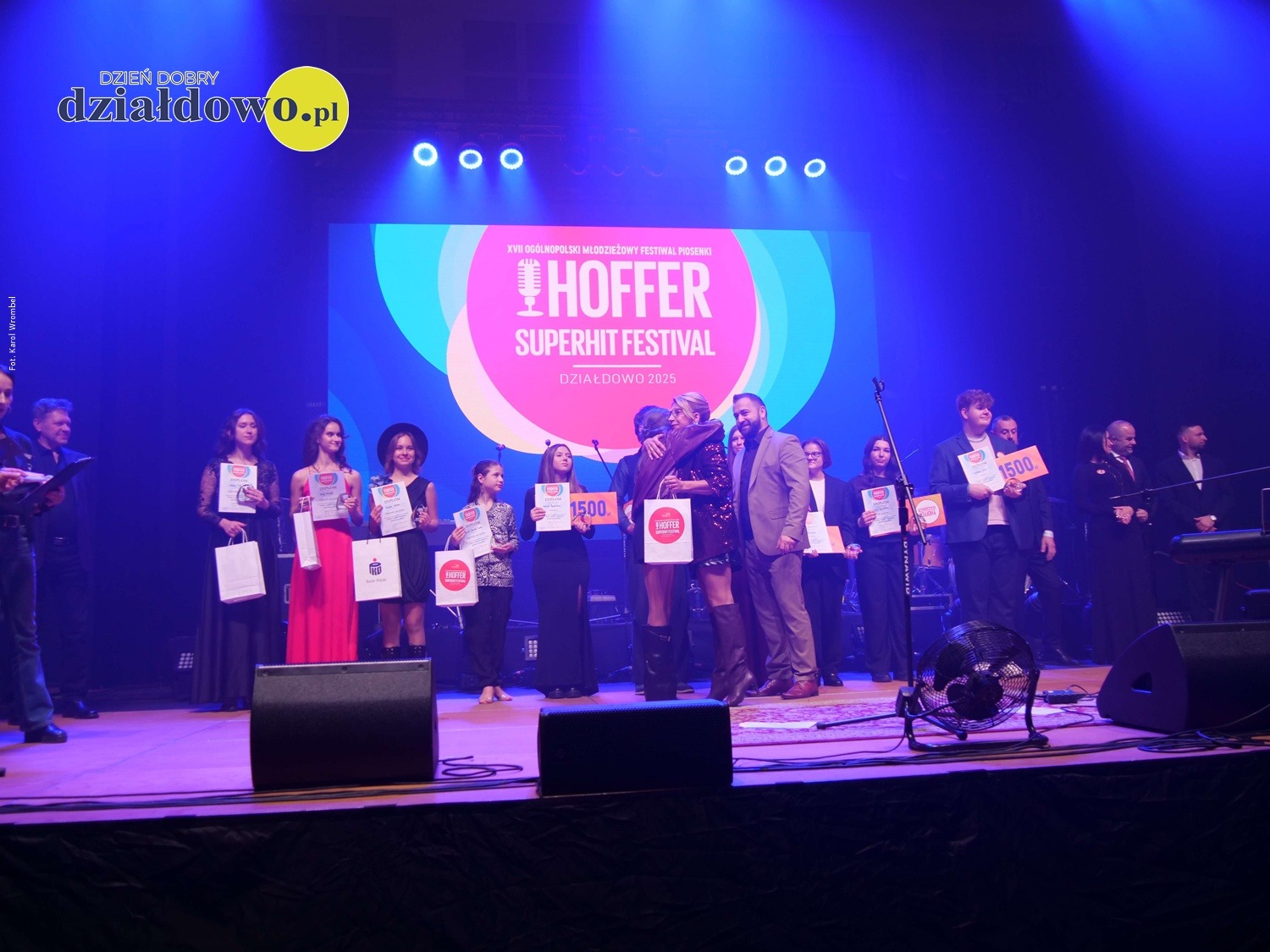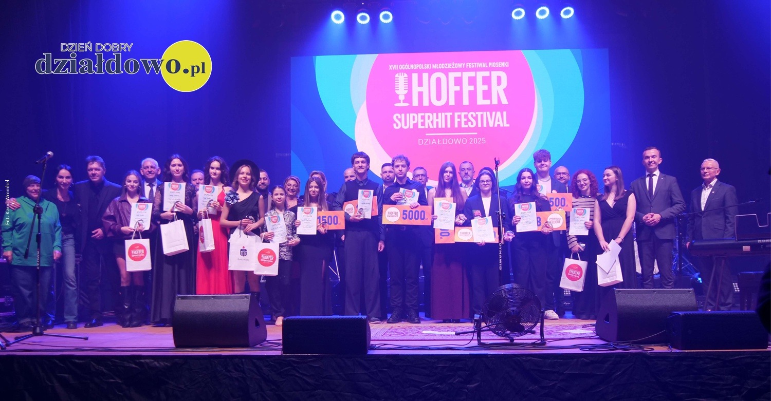(Na zdjęciu głównym pamiątkowa fotografia laureatów XVII Ogólnopolskiego Młodzieżowego Festiwalu Piosenki Hoffer Superhit Festival Działdowo 2025 wraz z jurorami, patronami i sponsorami)