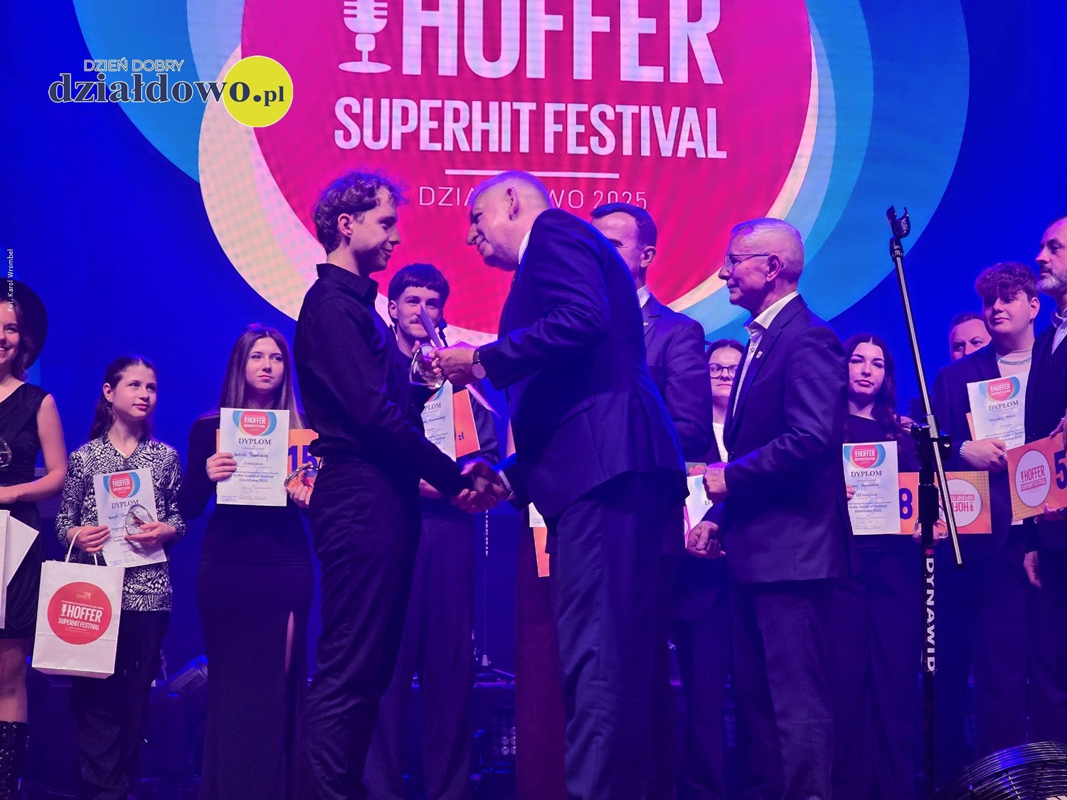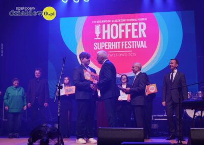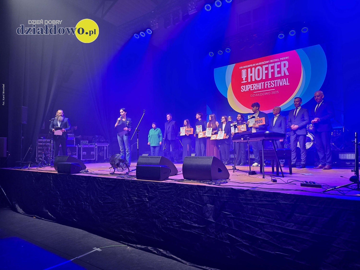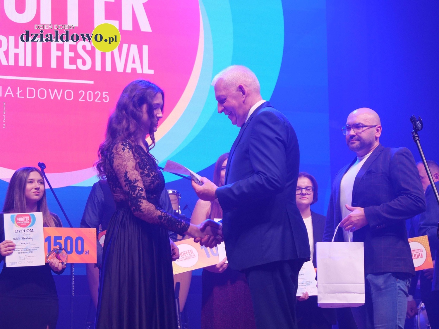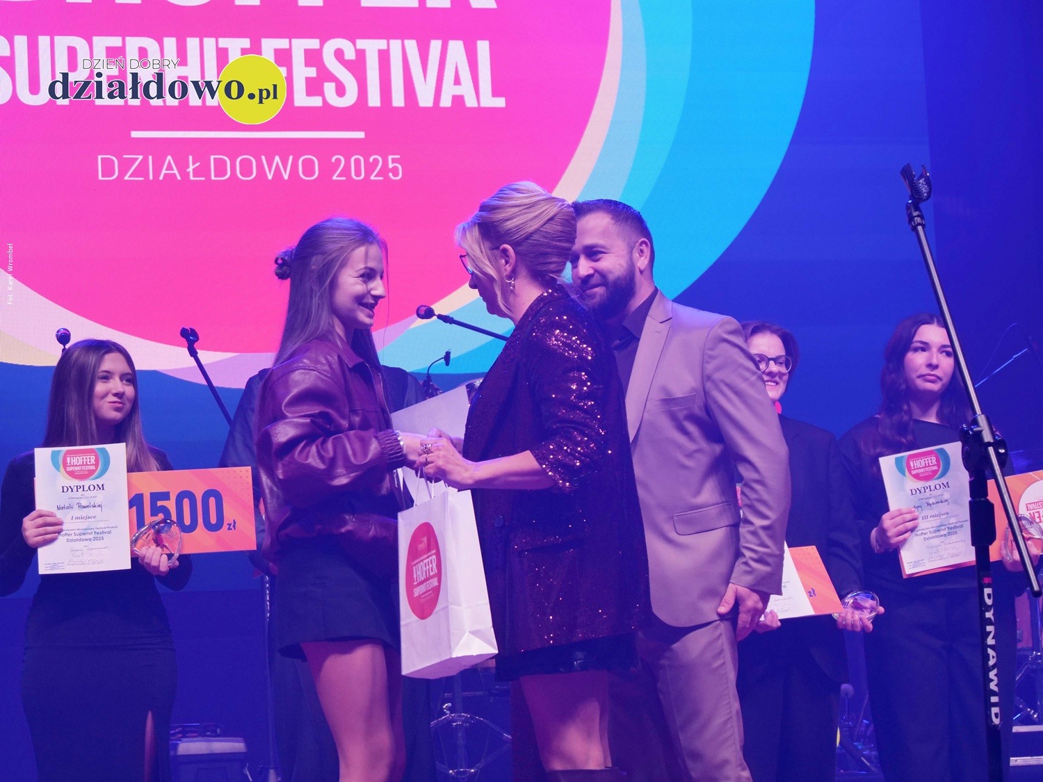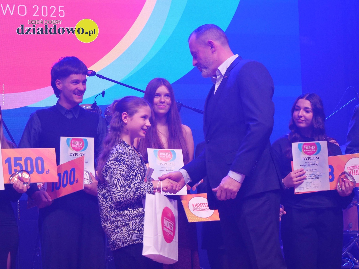 (Na zdjęciu głównym pamiątkowa fotografia laureatów XVII Ogólnopolskiego Młodzieżowego Festiwalu Piosenki Hoffer Superhit Festival Działdowo 2025 wraz z jurorami, patronami i sponsorami)