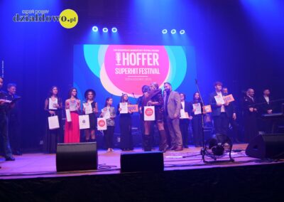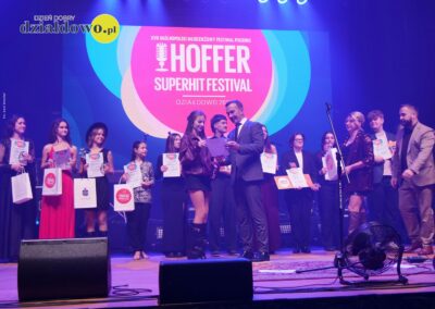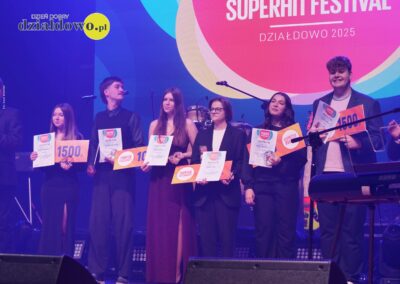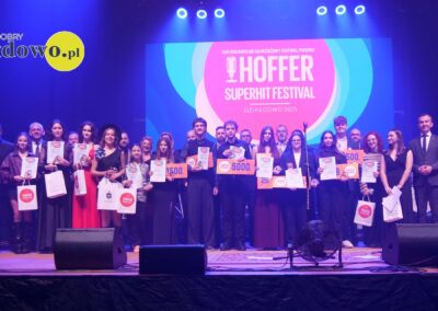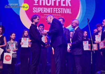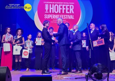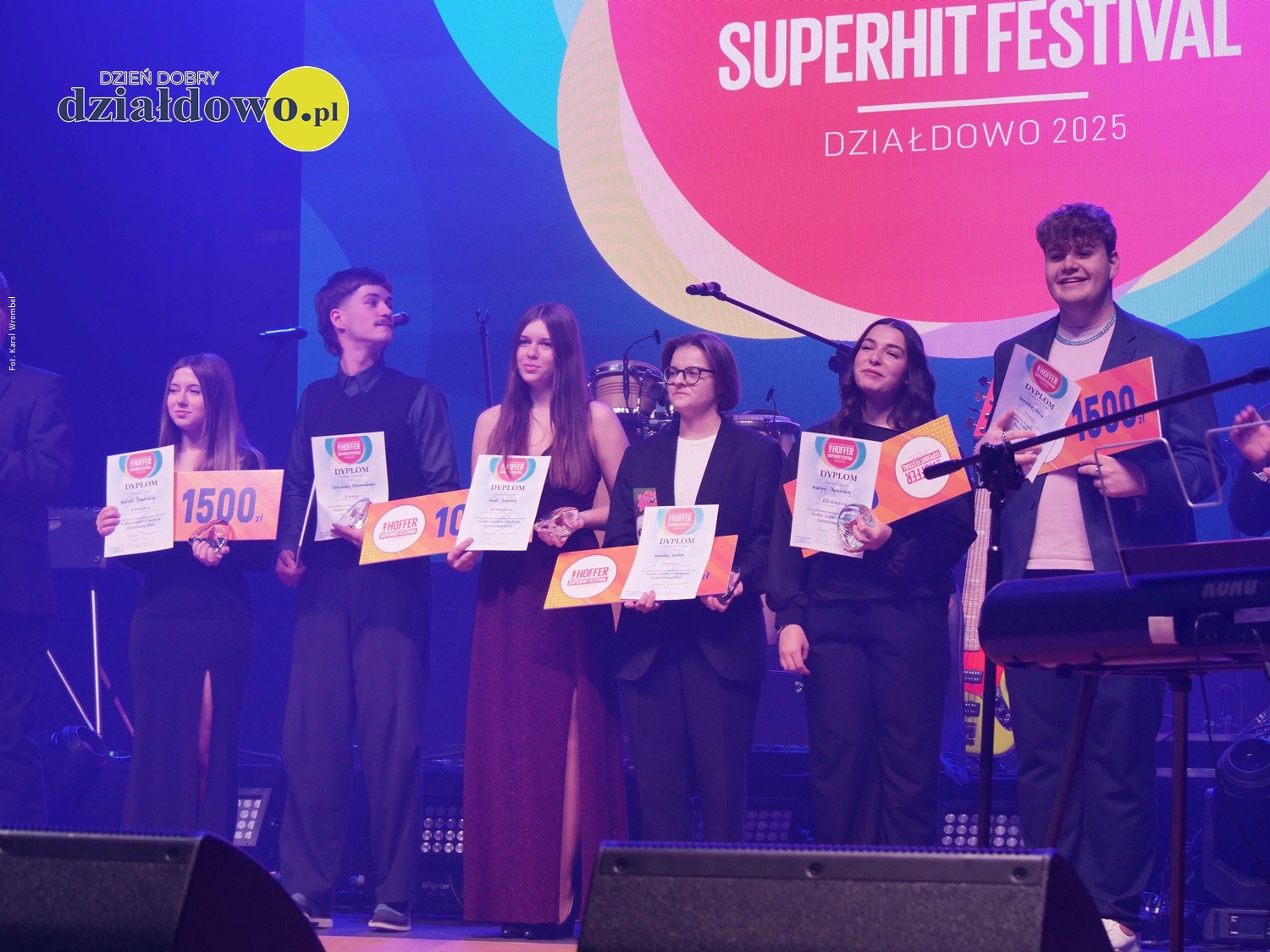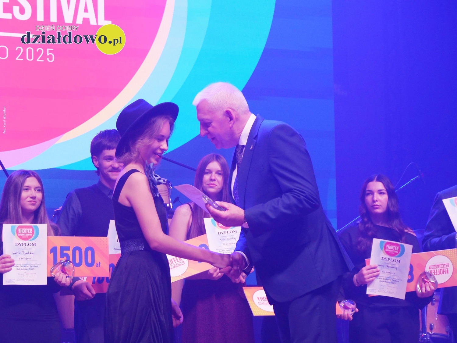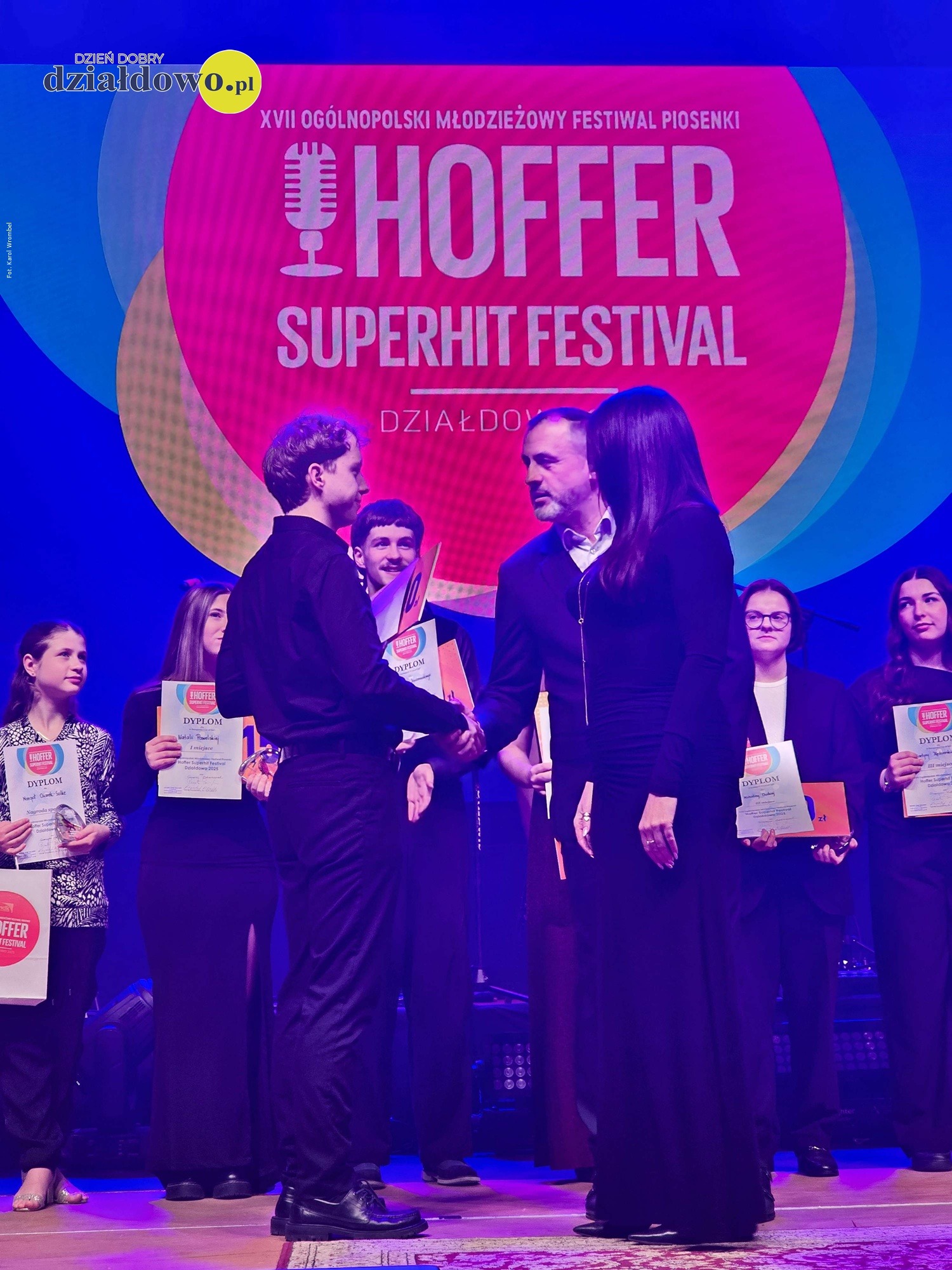 (Na zdjęciu głównym pamiątkowa fotografia laureatów XVII Ogólnopolskiego Młodzieżowego Festiwalu Piosenki Hoffer Superhit Festival Działdowo 2025 wraz z jurorami, patronami i sponsorami)